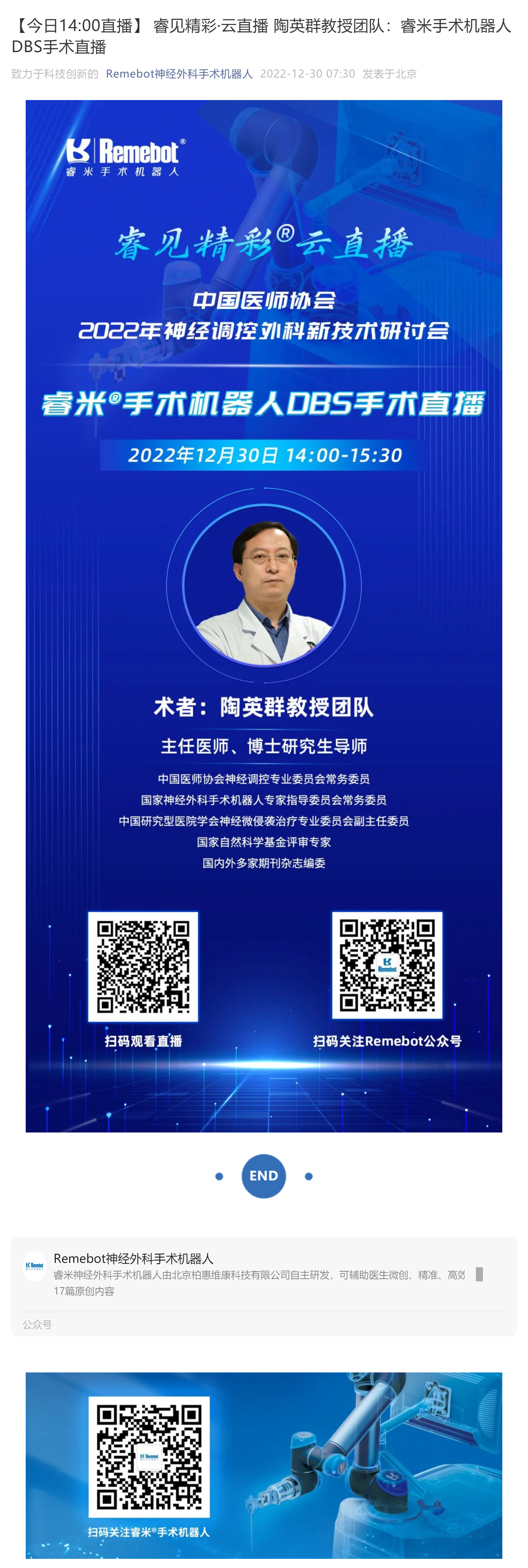 【今日14:00直播】 睿見精彩·云直播 陶英群教授團隊:睿米手術(shù)機器人DBS手術(shù)直播