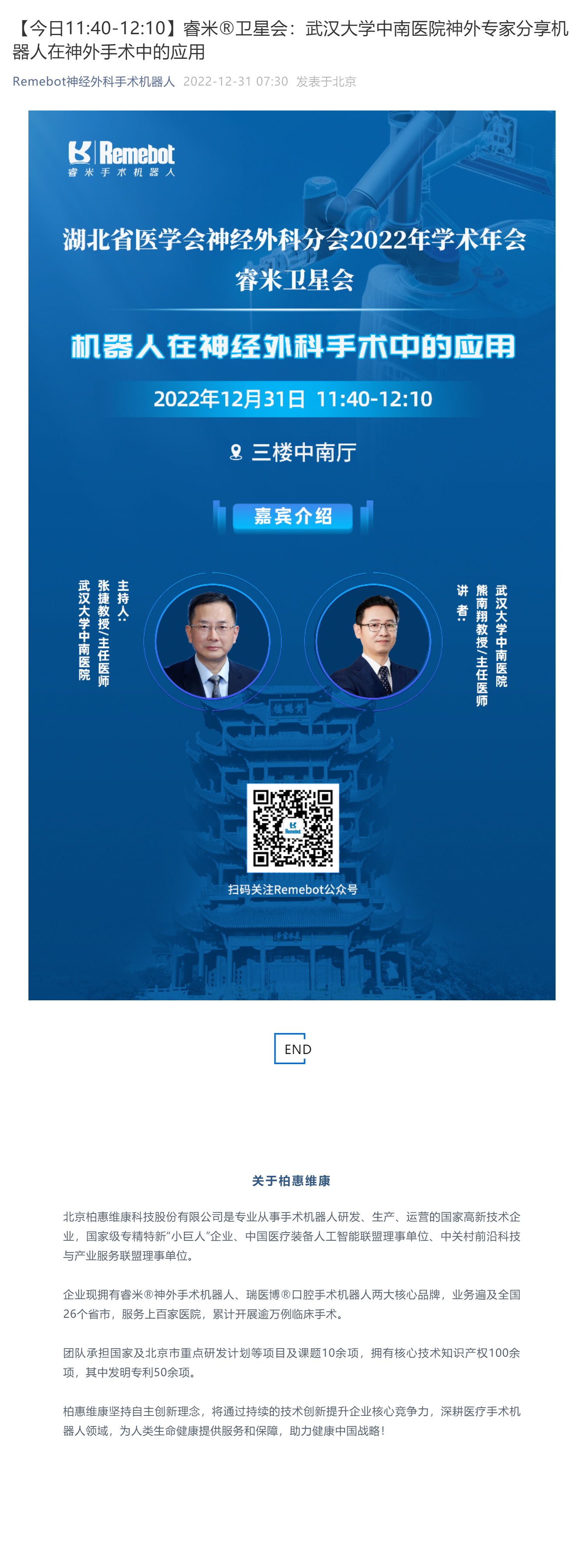 【今日11:40-12:10】睿米?衛(wèi)星會:武漢大學(xué)中南醫(yī)院神外專家分享機器人在神外手術(shù)中的應(yīng)用